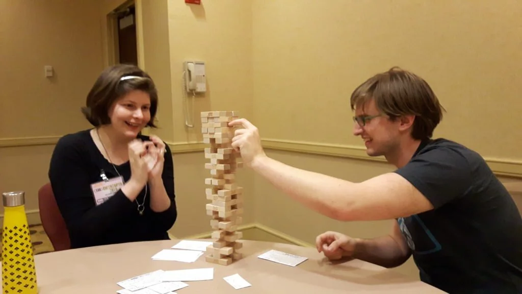 In Star Crossed, you and your fellow player will craft characters who are powerfully attracted to each other, but have a compelling reason not to act on their feelings. You’ll watch the attraction between them grow as you play out scenes, taking turns describing what your character says and does. Some of the things you’ll want your character to do are going to increase that attraction — and when that happens, you are going to pull a Jenga brick out from an increasingly shaky tower and place it on top.