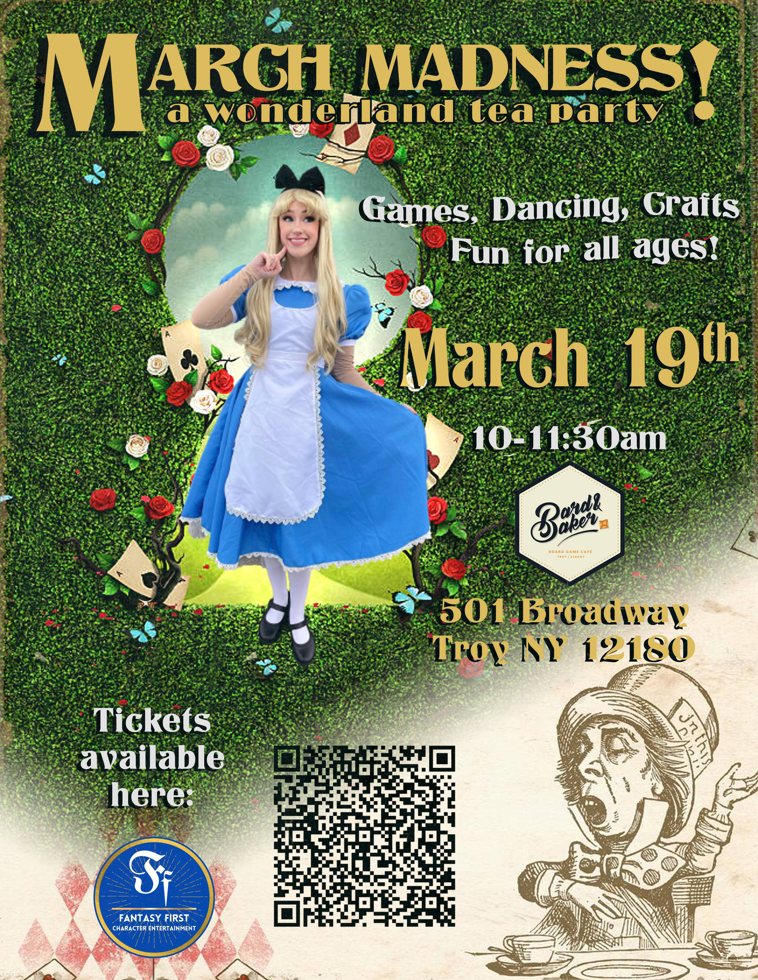 Alice and several of her friends from Wonderland will be visiting Bard and Baker to have a Tea Party with you! Be warned though, in Wonderland, not even tea parties are ordinary! Games, stories, dancing, photo & autograph opportunities and more! This event is open for all ages. Children and grownups both encouraged to attend, and guaranteed to have a topsy-turvy good time.