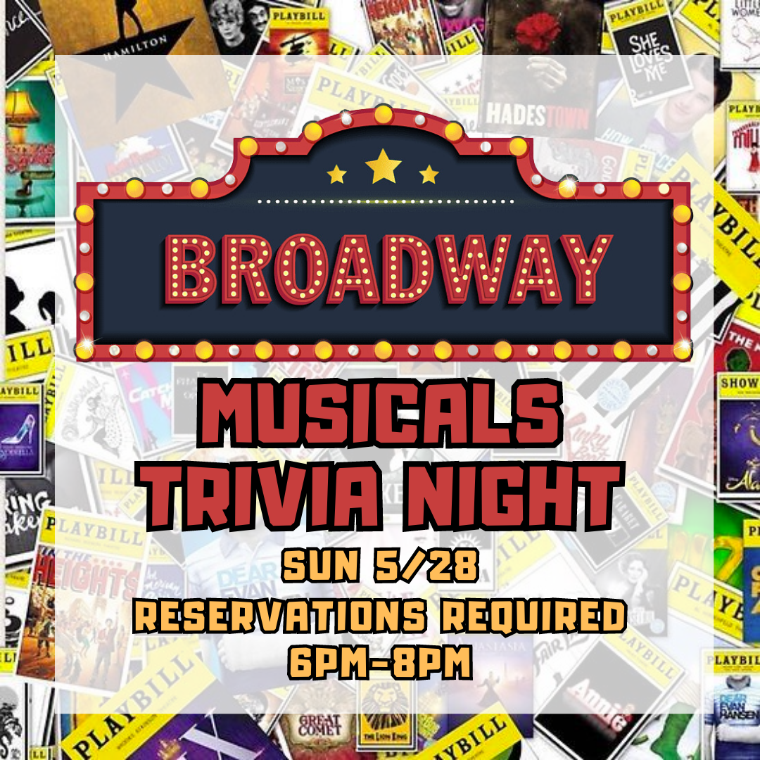 Trivia host Andrew is back on Sunday May 28th for another exciting round of themed trivia, this time focused on Broadway musicals!!