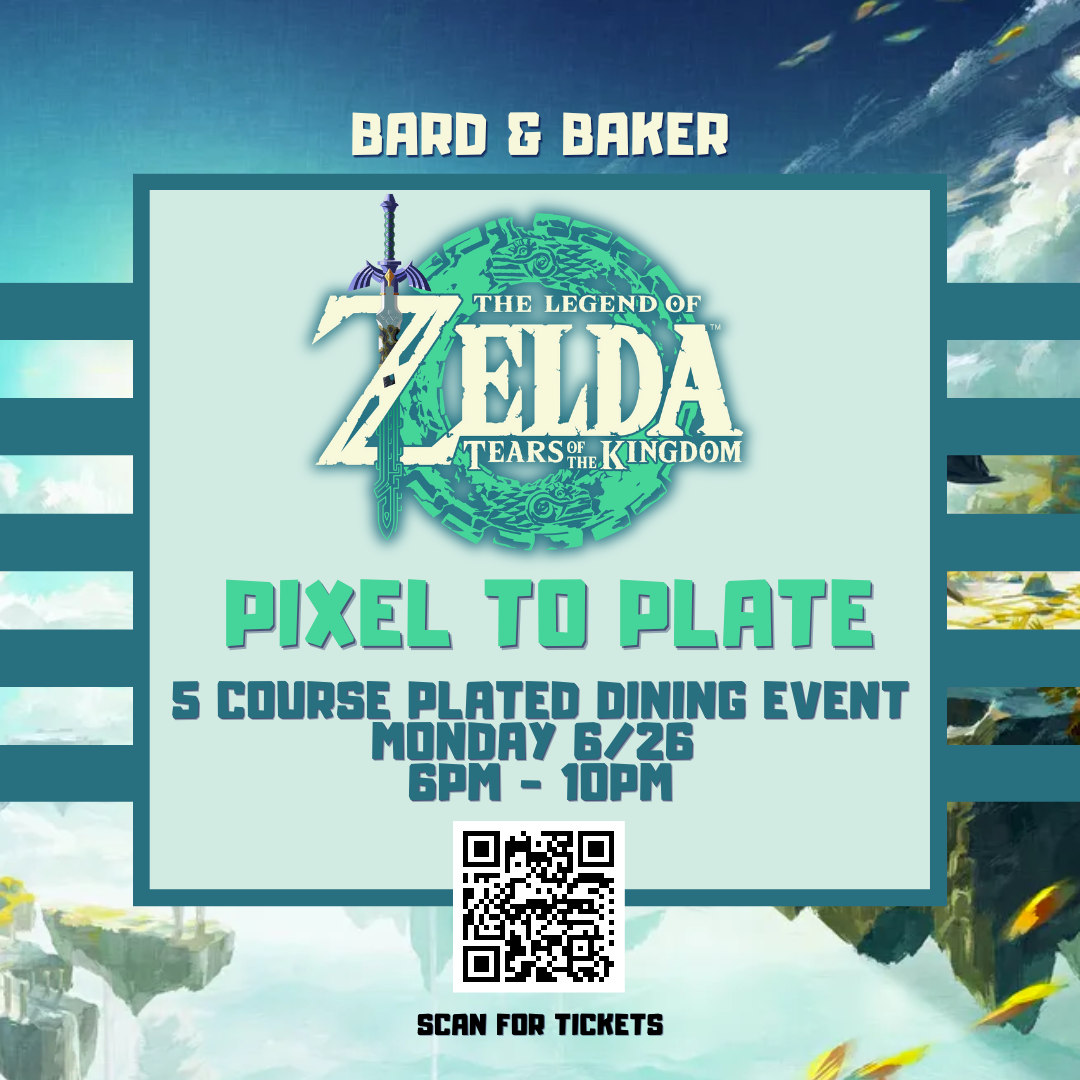 The dinner you’ve all been waiting for!! Please join us at Bard & Baker for our LEGEND OF ZELDA: TEARS OF THE KINGDOM inspired 5 course dinner of our Pixel to Plate video game inspired series at Bard & Baker Troy on Monday June 26th at 6:00 PM!