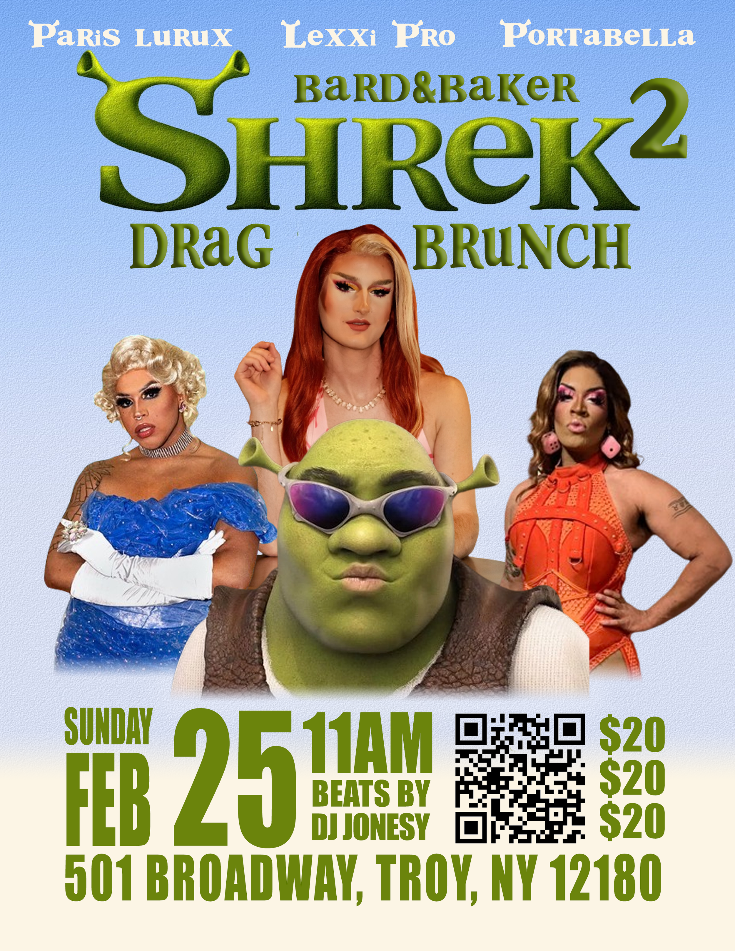 Join your host Typhoid Mary in a Far Far Away land (Troy) for an exciting morning! Joining them on their adventure is the ever glamourous Paris LuRux and Portabella Drag! All the hottest swamp beats will be provided by DJ Mercy!