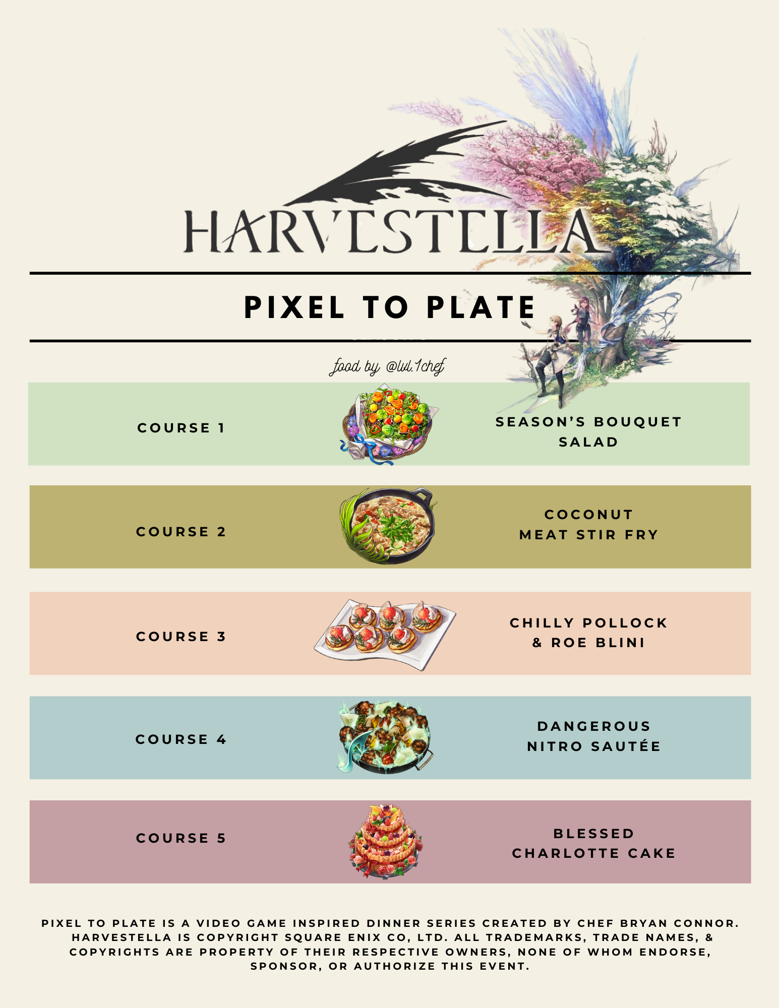 $65.00 per person gets you a ticket to an exclusive 5 course, unique dining experience of Harvestella themed dishes, created by Executive Chef Bryan Connor, aka Lvl.1 Chef.