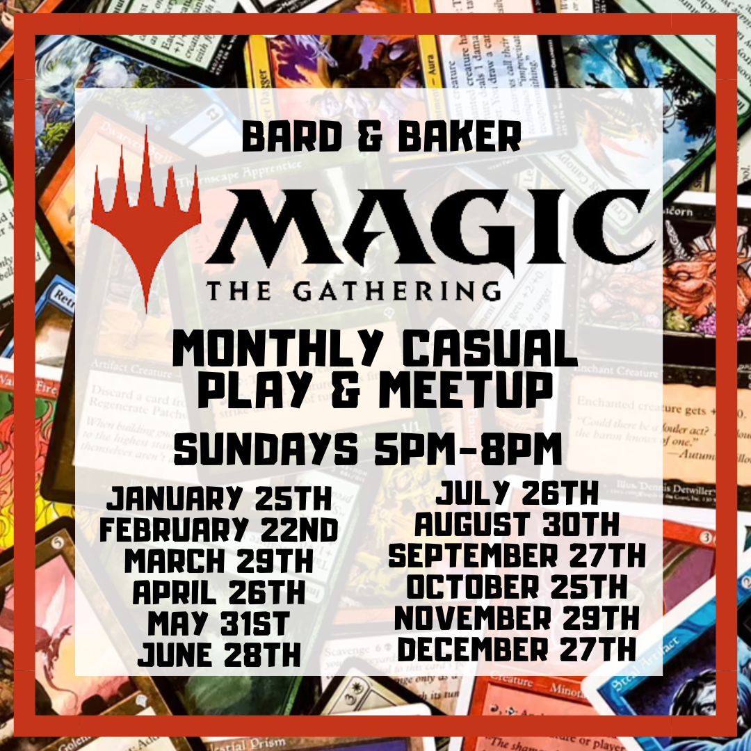 Join us at Bard & Baker on the last Sunday of every month 5pm-8pm for our monthly Magic the Gathering Casual Play & Meetup Night!